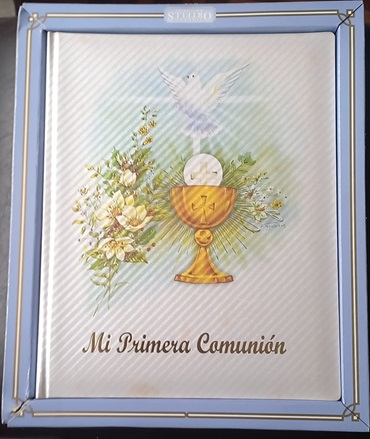 Álbum de fotos de Primera Comunión de la Editorial Alfredo Ortells España 🇪🇸 tapa acolchada nacarina con destellos, hojas con dibujos a colores, papel couche. Presenta espacio para poner datos de la Primera Comunión, firmas – autógrafos y fotos. Viene en caja.