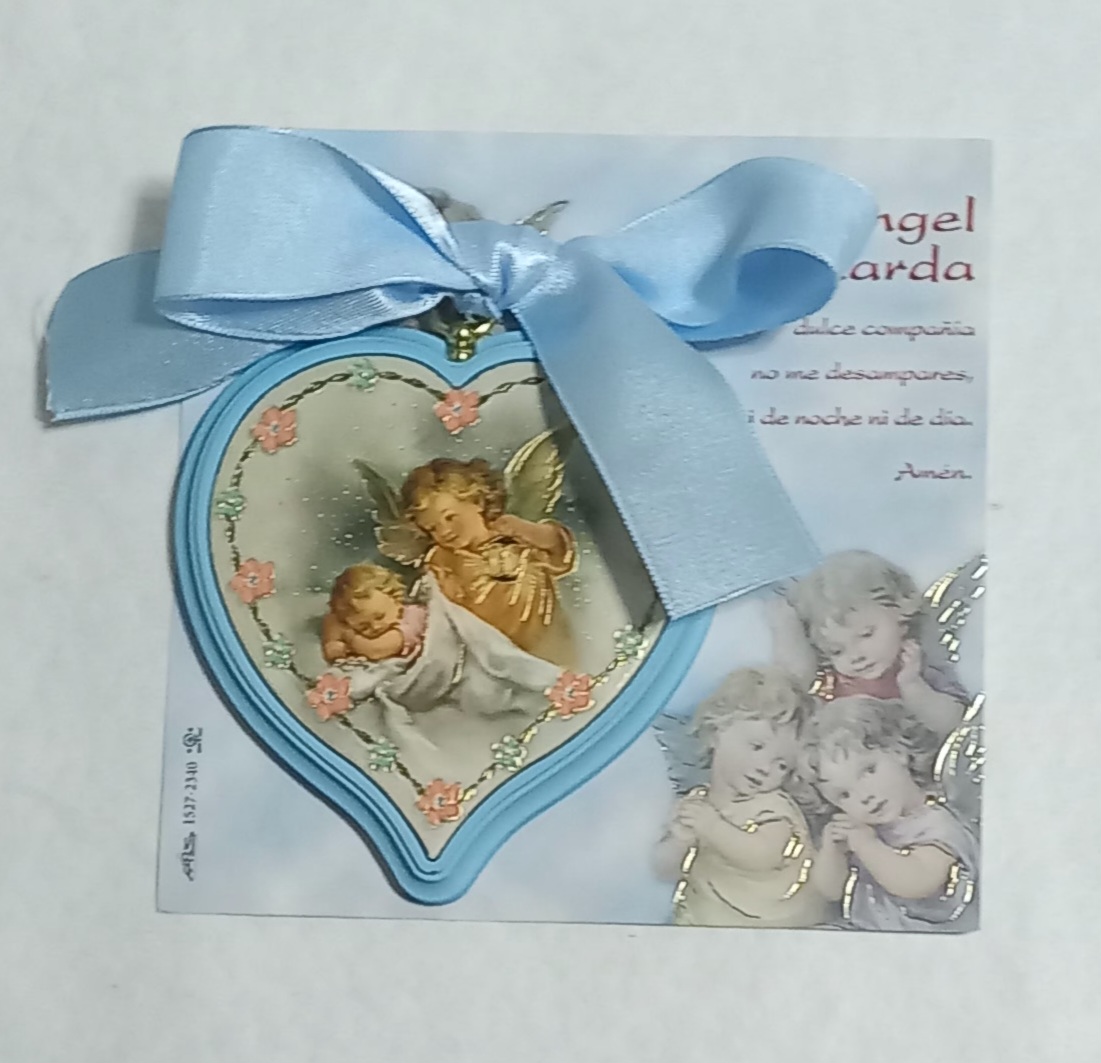 Bello Cunero o Medallón de cuna corazón, Italiano 🇮🇹 en madera con la imagen del Angel de la Guarda con farol en celeste. Para colgar en la cuna del niño/a.
