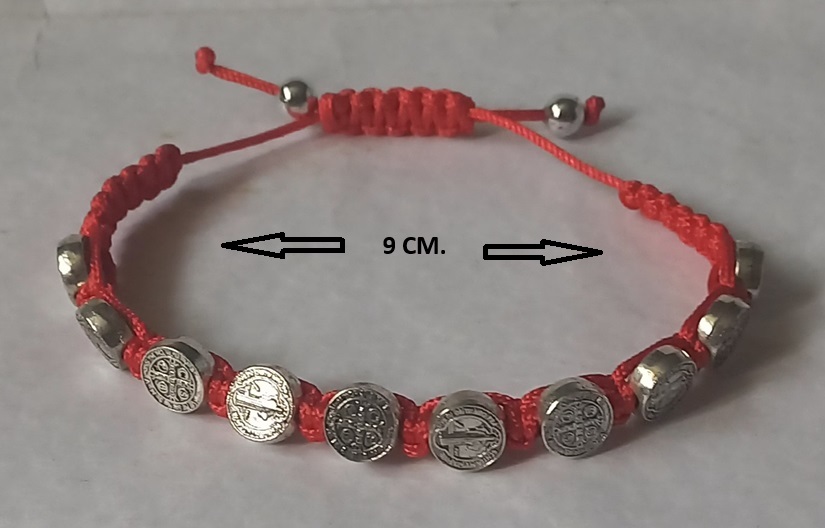 Pulsera denario italiana 🇮🇹 autoajustable tejido macramé con la imagen de San Benito en color rojo.