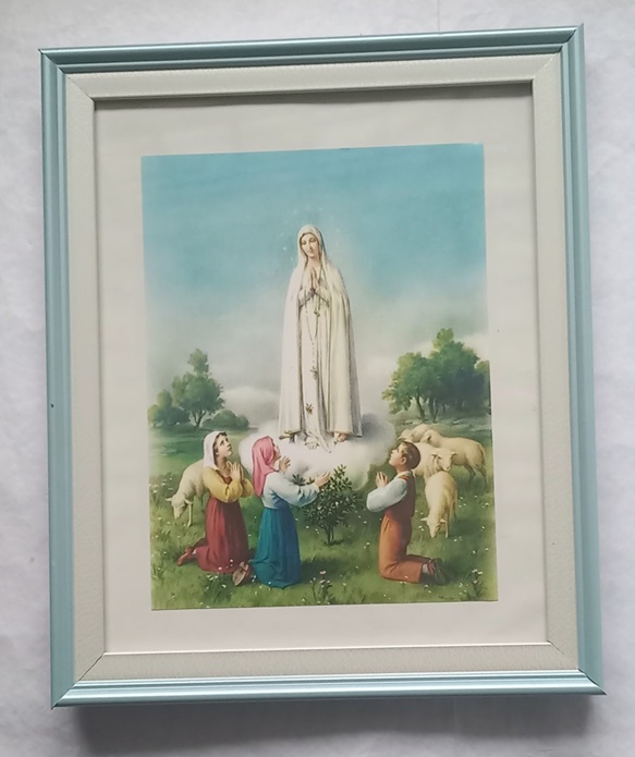 Cuadro nacional 🇵🇪 con imagen italiana 🇮🇹 de la Virgen de Fátima, para pared y/o mesa. Con paspartú y vidrio simple. Vienen en caja.