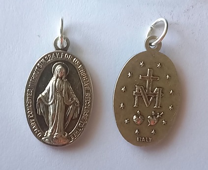 Medalla italiana oval grande de alpaca con la imagen de la Virgen Milagrosa y en el reverso aparece la M de María y las 12 estrellas. Inscripción en inglés “O Mary conceived without sin, pray for us who have recourse to thee”. Que significa (Oh María, concebida sin pecado, ruega por nosotros que recurrimos a ti)